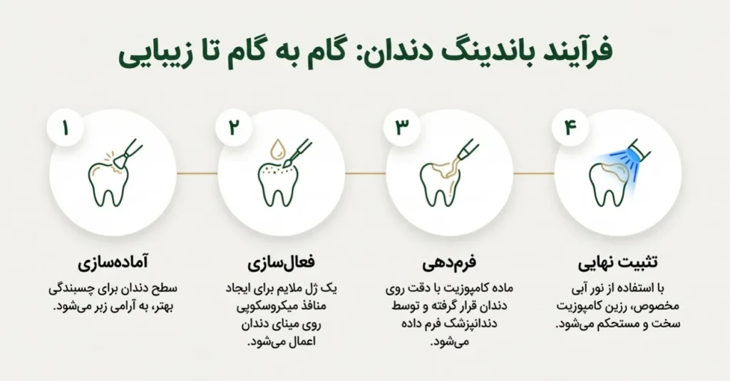 در روش باندینگ، دندانپزشک از یک رزین کامپوزیت همرنگ دندان استفاده میکند. ابتدا سطح دندان برای چسبندگی بهتر، کمی زبر میشود. سپس یک ژل اسیدی ملایم برای باز کردن منافذ میکروسکوپی روی مینای دندان اعمال میگردد. پس از شستشو، ماده کامپوزیت با دقت روی دندان قرار گرفته، فرم داده میشود و با نور آبی مخصوص سفت میگردد. این فرآیند معمولاً در یک جلسه و بدون نیاز به بیحسی انجام میشود و هزینهای مقرونبهصرفهتر دارد. دوام باندینگ دندان بسته به مراقبت، بین ۵ تا ۱۰ سال است.